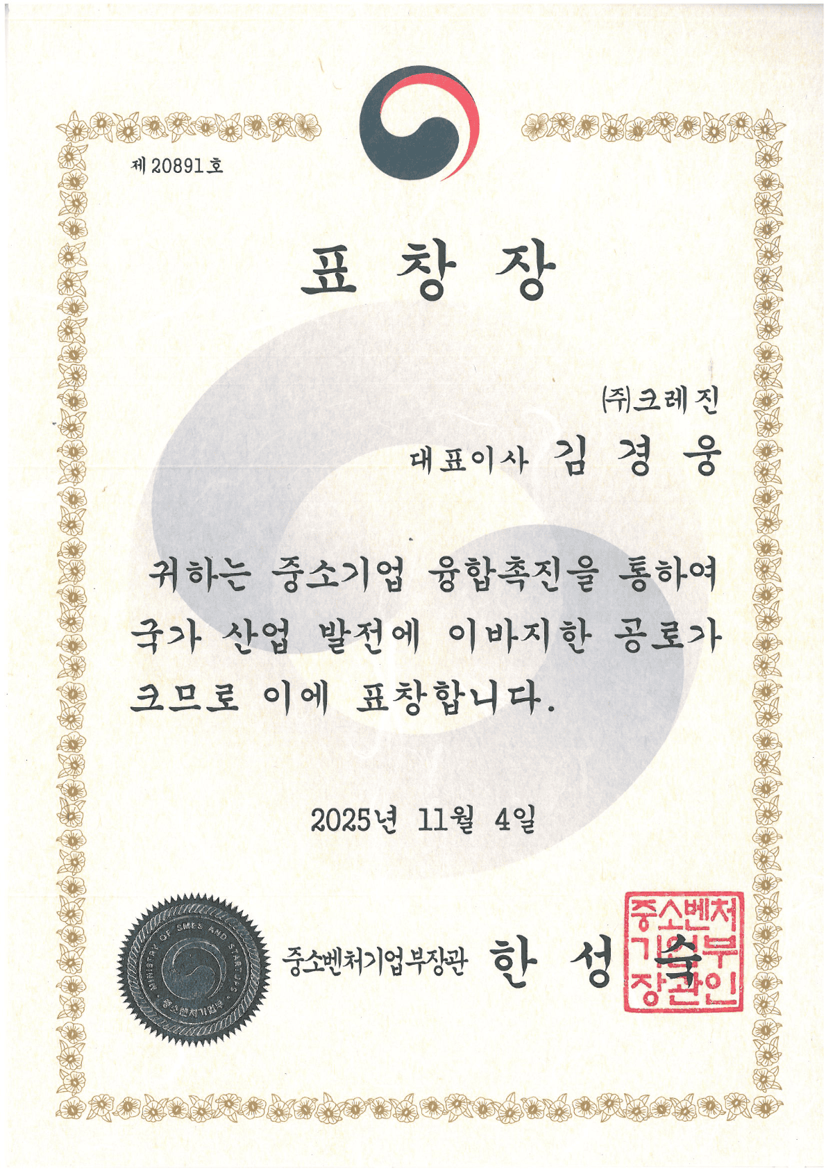 중소벤처기업부장관 표창장